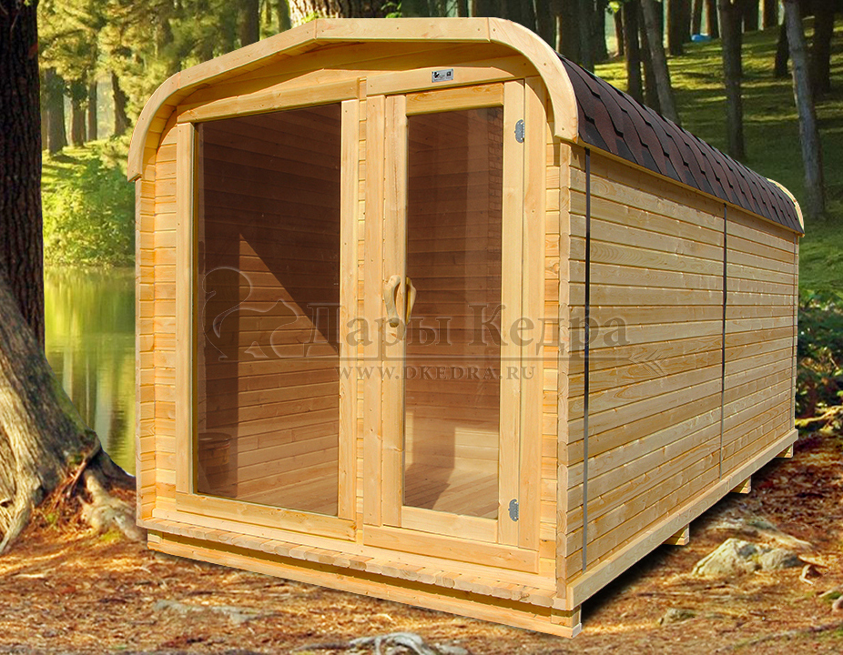 Баня-бочка овальная из кедра 4 метра Овальная баня-бочка из кедра просторная и вместительная. Имеет два отделения: раздевалку, которую можно использовать как комнату отдыха, и парилку. Для удобства пользования раздевалка оснащена лавочкой, полкой и вешалкой из кедра. В парильном отделении располагается печь и двухуровневый открытый полок. Для установки такой модели не требуется полноценный фундамент, поэтому при необходимости ее можно перенести на другое место. Так же баню-бочку можно укомплектовать верандой со скамейками, козырьком и печью с внешней загрузкой, благодаря которой весь мусор после топки останется на улице. Древесина кедра насыщена эфирными маслами и фитонцидами, которые активируются при воздействии температур. Таким образом, парение в каркаско-щитовых банях из кедра вдвойне полезно.