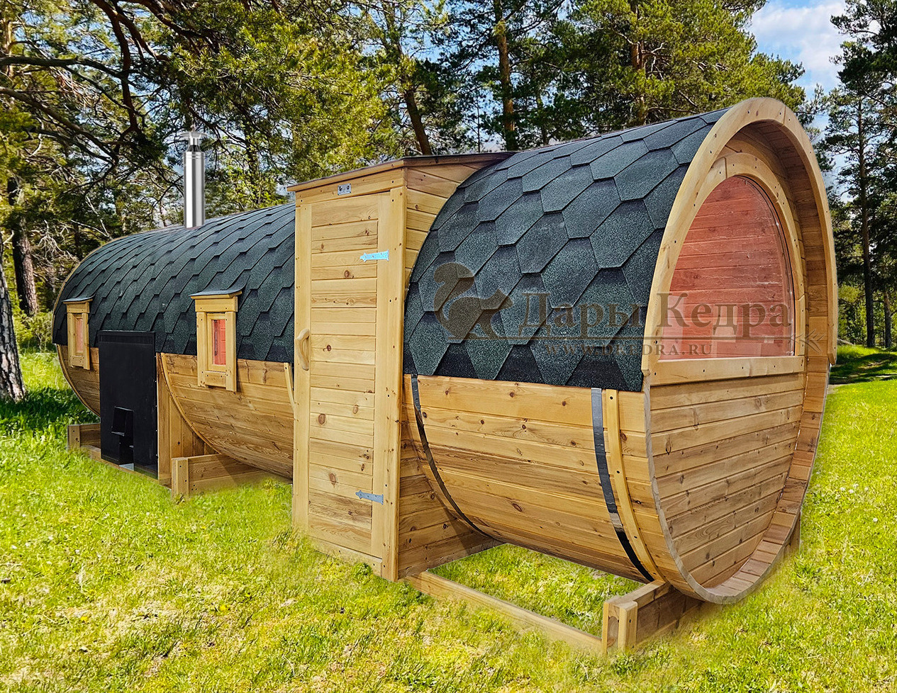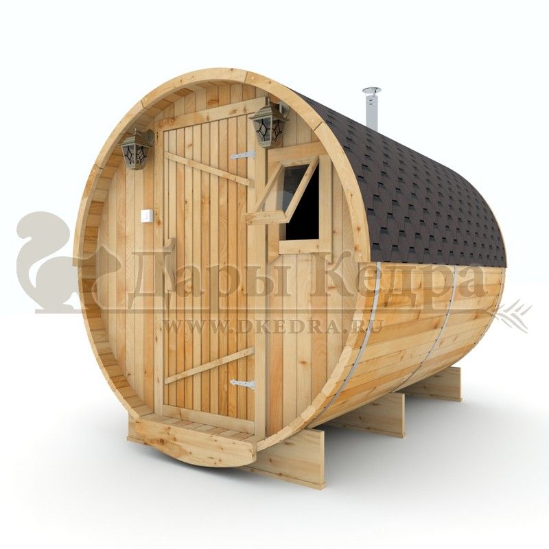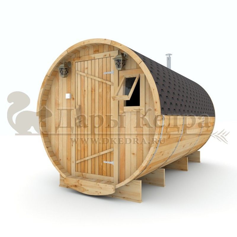 Баня-бочка буханка из кедра 3,5 метра Это более просторная модель за счет увеличенной высоты потолков и ровного пола. В такой модели раздевалка совмещена с моечной. Тут установлен душевой поддон, вешалка, полочка и лавочка из кедра. В парильном отделении по обе стороны расположены двухуровневые открытые полки, печь находится между ними у дальней стены. Время растопки такой бани не превышает 30 минут. По вашему желанию баню-бочку можно укомплектовать козырьком, верандой и печью с внешней загрузкой, благодаря которой весь мусор во время топки остается на улице. Баня-бочка буханка не требует полноценный фундамент, поэтому при необходимости ее можно перенести в другое место. Обращаем Ваше внимание, что в стандартную комплектацию бани входят полки открытого типа в парной с обеих сторон. Дополнительно можно заказать полок закрытого типа или лавку! Кедр обладает ароматическими свойствами. Он не деформируется и влагоустойчив, при правильном уходе за деревом на нем не развиваются грибки и плесень.