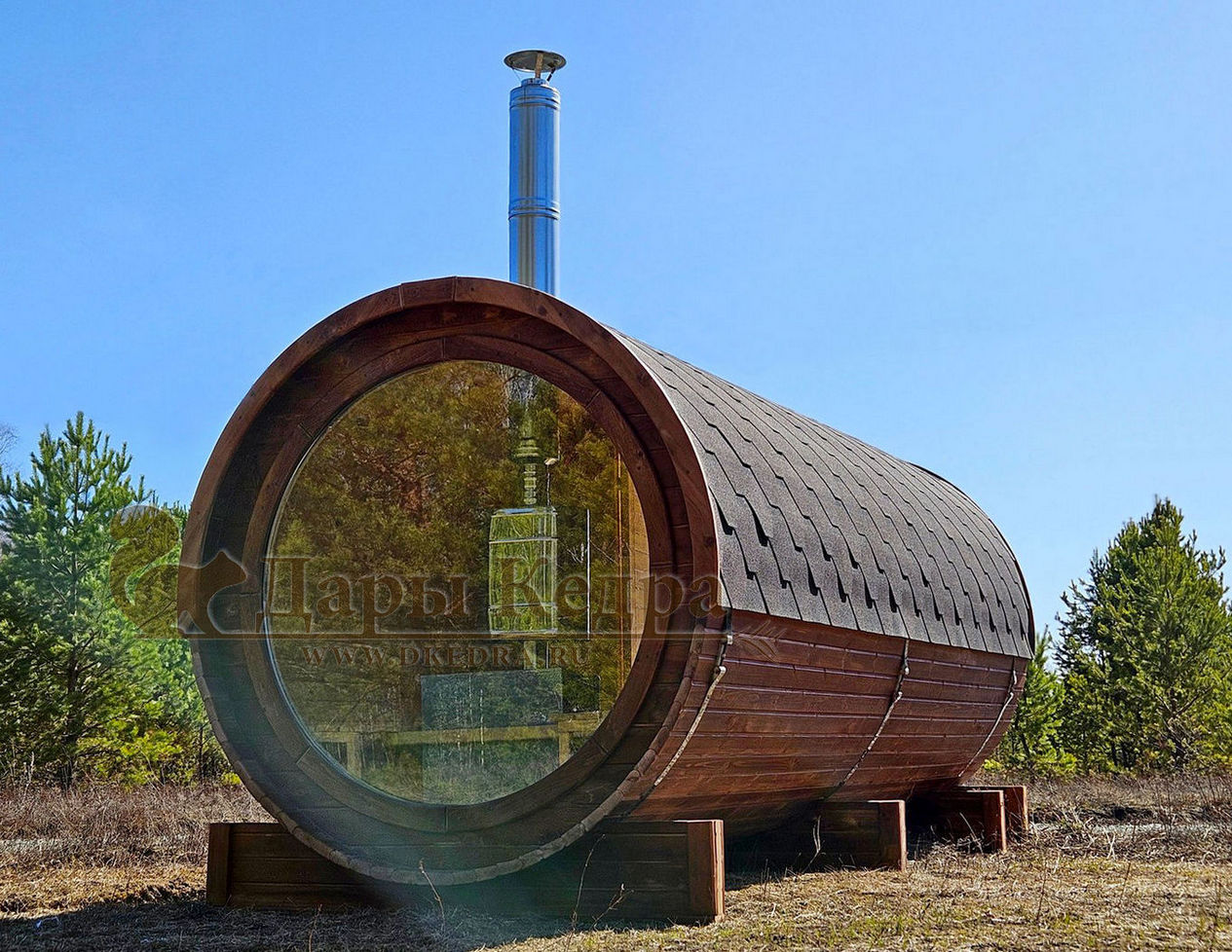 Баня-бочка круглая из кедра 4 метра Это изделие круглой вытянутой формы с двумя отделениями: раздевалкой и парной. Лавочки из кедра находятся по всей длине бани-бочки с обеих сторон. Печь расположена в парилке около дальней стены. Для удобства пользования в раздевалке установлена вешалка и полочка из кедра. За счет небольшой конструкции баня нагревается не более 30 минут. По вашему желанию баню-бочку можно дополнить печью с внешней загрузкой, благодаря которой весь мусор после топки останется на улице. Круглая баня-бочка не требует полноценный фундамент, поэтому при необходимости ее можно перенести в другое место. Обращаем Ваше внимание, что в стандартную комплектацию бани входят лавки в парной с обеих сторон. Дополнительно можно заказать полок открытого или закрытого типа! Кедр обладает ароматическими свойствами. Он не деформируется и влагоустойчив, при правильном уходе за деревом на нем не развиваются грибки и плесень.