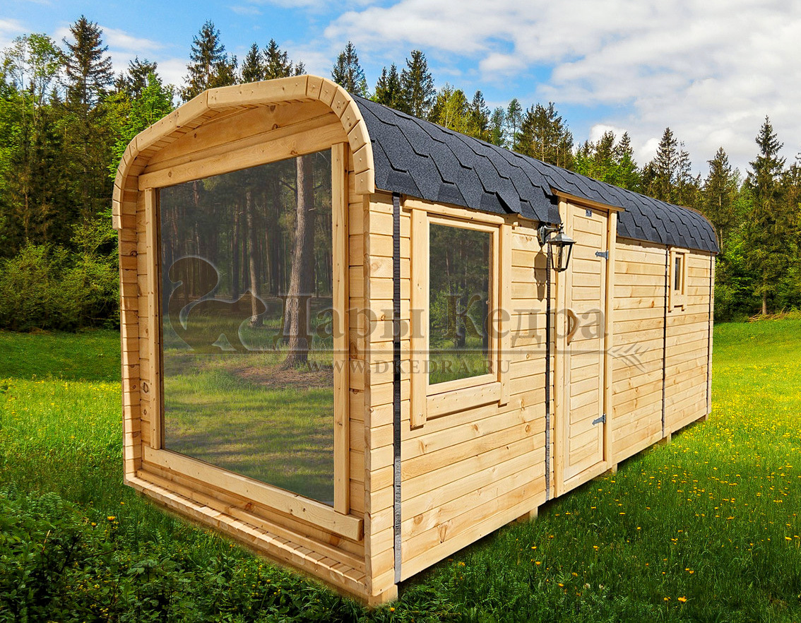 Баня-бочка «Пентагон» с панорамным окном Стильная и современная баня-бочка может быть выполнена длиною от 4 метров, с двумя отделениями (парилка и комната отдыха). Полок может быть, как с двух сторон, так и угловой, в стандарте двухуровневый. Печь в данной модели расположена сбоку с топкой внутрь парилки, либо наружу или в соседнее помещение. Печь можно укомплектовать баком для воды, а саму баню сделать длиною до 6 метров, комфортно разместив в ней дополнительно помывочную. Панорамное окно на входе добавит света и уюта в раздевалке. Установив баню в живописном месте, во время процедур можно наслаждаться видами из окна. В эту модель включено одно закаленное квадратное стекло в комнате отдыха. Обращаем Ваше внимание, по умолчанию в данной модели отсутствует бак для воды, вместо него идёт утеплённая термо-труба, которую можно заменить на бак по желанию.