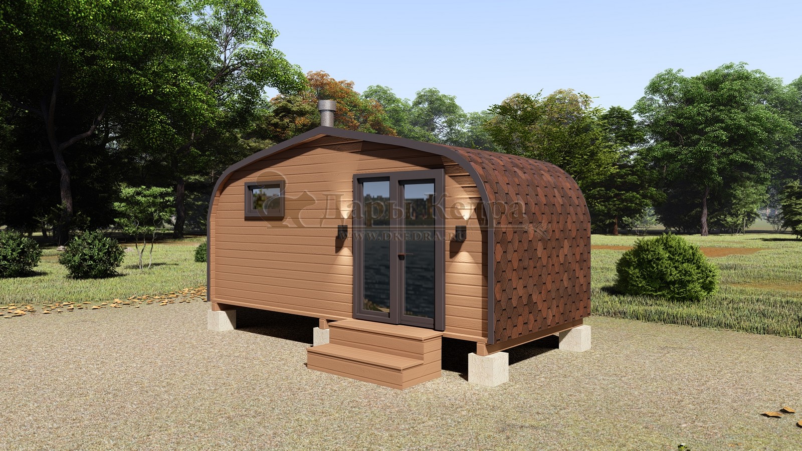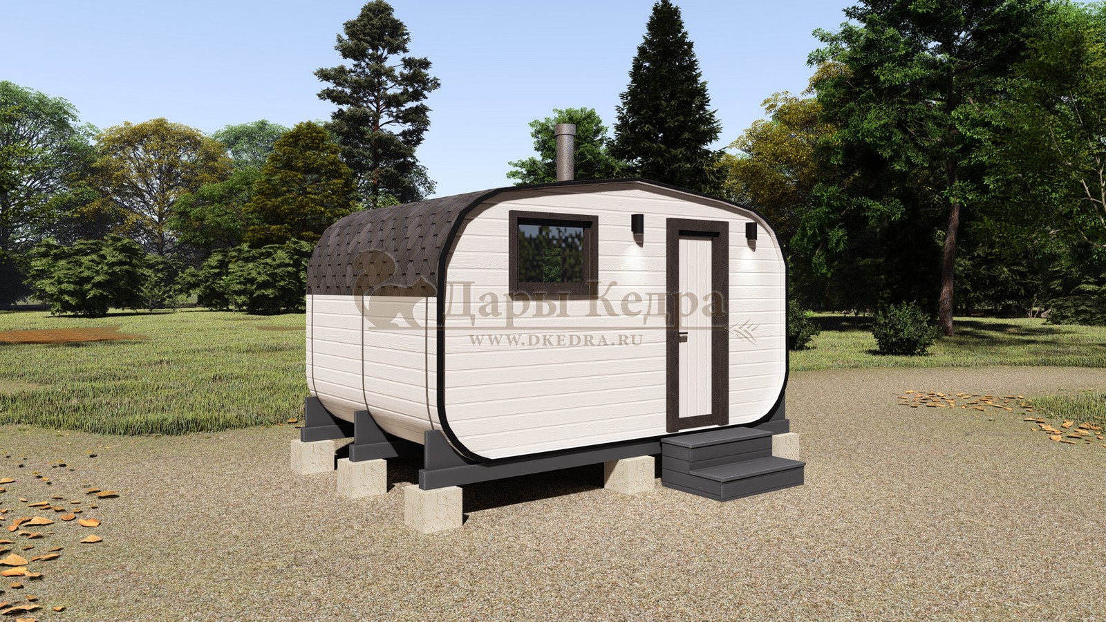 Баня-бочка «Орео» с боковым входом и панорамным окном Стильная и современная баня-бочка с боковым входом может быть выполнена длиною от 4 метров, что-бы было два отделения (парилка и комната отдыха). Полок может быть, как с двух сторон, так и угловой, в стандарте одноуровневый. Печь в данной модели расположена сбоку с топкой наружу, либо внутрь парилки. Печь можно укомплектовать баком для воды, а саму баню сделать длиною до 6 метров, комфортно разместив в ней дополнительно помывочную. В эту модель включено два закаленных стеклопакета: круглое и полукруг, которые мы можем разместить на ваше усмотрение в парилке и комнате отдыха. Обращаем Ваше внимание, по умолчанию в данной модели отсутствует бак для воды, вместо него идёт утеплённая термо-труба, которую можно заменить на бак по желанию.
