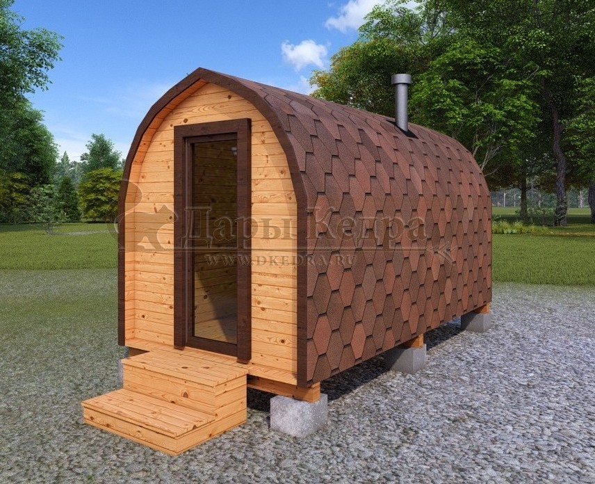 Баня-бочка буханка из кедра 3 метра Это более просторная модель за счет увеличенной высоты потолков и ровного пола. В такой модели раздевалка совмещена с моечной. Тут установлен душевой поддон, вешалка, полочка и лавочка из кедра. В парильном отделении по обе стороны расположены двухуровневые открытые полки, печь находится между ними у дальней стены. Время растопки такой бани не превышает 30 минут. По вашему желанию баню-бочку можно укомплектовать козырьком, верандой и печью с внешней загрузкой, благодаря которой весь мусор во время топки остается на улице. Баня-бочка буханка не требует полноценный фундамент, поэтому при необходимости ее можно перенести в другое место. Обращаем Ваше внимание, что в стандартную комплектацию бани входят полки открытого типа в парной с обеих сторон. Дополнительно можно заказать полок закрытого типа или лавку! Кедр обладает ароматическими свойствами. Он не деформируется и влагоустойчив, при правильном уходе за деревом на нем не развиваются грибки и плесень.