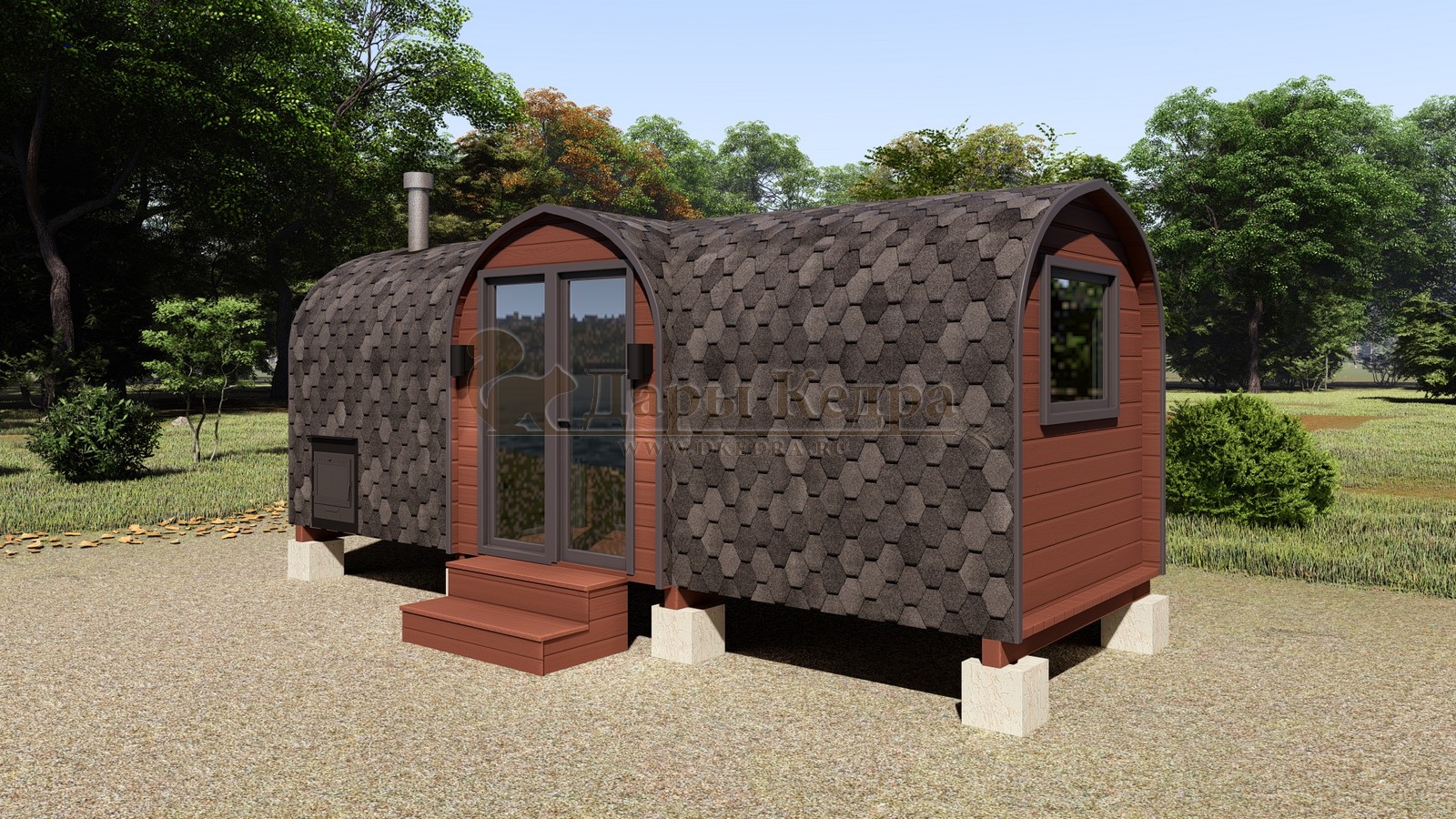 Баня-бочка буханка из кедра 6 метров с верандой Главной отличительной особенностью данной бани «Буханка» является полная обшивка гибкой черепицей всей внешней части бани, а так же наличие крытой входной группы. Включает в себя небольшую веранду, раздевалку, которая служит комнатой отдыха, моечную и парильное отделение. Для удобства пользования в раздевалке находятся лавочки и вешалка из кедра. Моечная оборудована душевым поддоном, полочкой и лавочкой. В парильном отделении по обе стороны расположены двухуровневые открытые полки, печь установлена между ними у дальней стены. Время растопки такой бани не превышает 30 минут. По вашему желанию баню-бочку можно укомплектовать козырьком, верандой и печью с внешней загрузкой, благодаря которой весь мусор после топки остается на улице. Баня-бочка буханка не требует полноценный фундамент, поэтому при необходимости ее можно перенести в другое место. Обращаем Ваше внимание, что в стандартную комплектацию бани входят полки открытого типа в парной с обеих сторон. Дополнительно можно заказать полок закрытого типа или лавку! Кедр обладает ароматическими свойствами. Он не деформируется и влагоустойчив, при правильном уходе за деревом на нем не развиваются грибки и плесень.