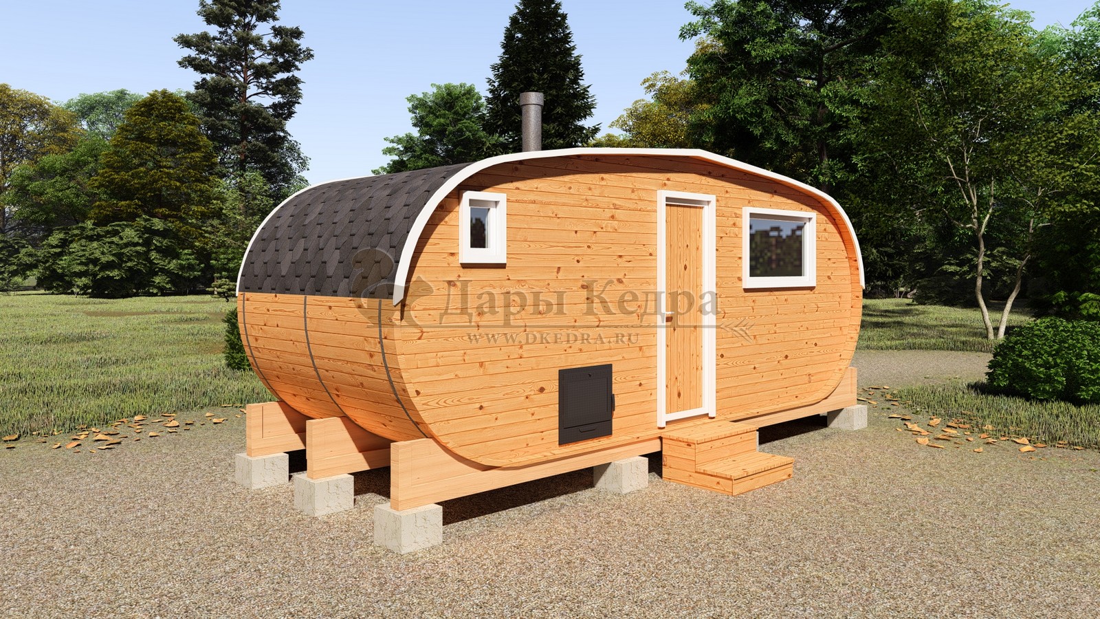 Баня-бочка буханка из кедра с боковым входом (все размеры) Это самая просторная модель бани. Благодаря этому ее можно использовать не только по назначению, но и в качестве летнего домика. Боковой вход у такой модели находится в начале или в середине конструкции. Моечная оснащена душевым поддоном. Двухуровневый открытый полок и лавочка в парилке сделает принятие процедур более комфортным. По вашему желанию баню-бочку можно дополнить печью с внешней загрузкой, благодаря которой весь мусор после топки останется на улице. Баня-бочка буханка из кедра с боковым входом не требует полноценный фундамент, поэтому при необходимости ее можно перенести в другое место. Обращаем Ваше внимание, что в стандартную комплектацию бани входят полки открытого типа в парной с обеих сторон. Дополнительно можно заказать полок закрытого типа или лавку! Кедр обладает ароматическими свойствами. Он не деформируется и влагоустойчив, при правильном уходе за деревом на нем не развиваются грибки и плесень.