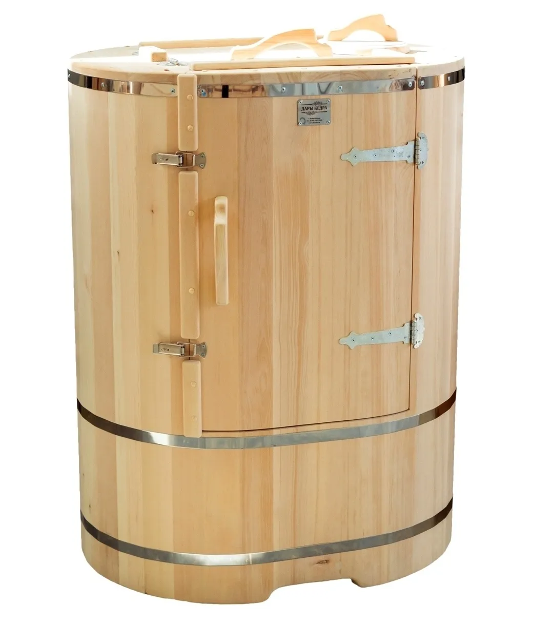 Кедровая бочка (фитобочка) овальная «Профессиональная» Овальная фитобочка из кедра - это мини парная, которую можно использовать не только в спа-салонах, но и дома. Овальная модель более просторна и удобна в использовании. Толщина стенок составляет 40-45 мм, что позволяет увеличить срок службы изделия. Она оборудована откидными створками, дверцей и отверстием для головы. Во время парения человек сидит внутри кедровой бочки, а голова находится снаружи. Благодаря этому исключается возможность перегрева. Подлокотники из кедра, встроенные ручки на створках и двери делают эксплуатацию более удобной. Парение в фитобочке благотворно влияет на организм в целом: повышается иммунитет, выводятся шлаки и токсины, улучшается работа органов тела и состояние кожи.